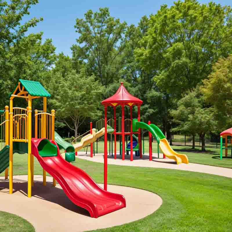 Plac z trzema zjeżdżalniami, dwoma huśtawkami oraz małpi gaj.